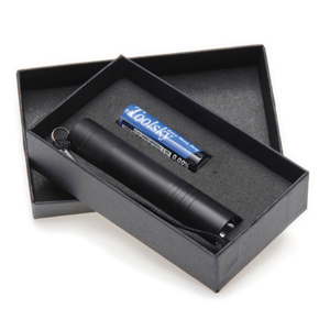 Алюминиевый корпус с сатинированным эффектом, прорезиненная кнопка включения в торце фонаря защищена от случайного включения. В комплект входит элемент питания. Фонарик упакован в подарочную картонную коробку черного цвета.