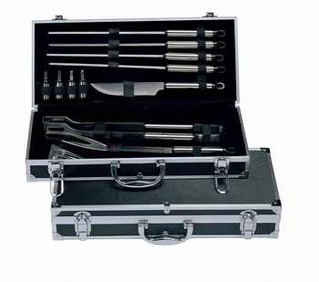 Набор для пикника из 12-ти предметов. В состав входят: 4 больших шампура, 4 маленьких шампура, нож для мяса, щипцы, вилка и лопатка. Упакован в кейс.