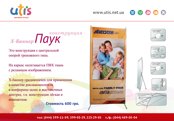Х-баннер предназначен для применения в качестве рекламоносителя в конференц-залах и выставочных центрах, т.к. конструкция лёгкая и компактная.