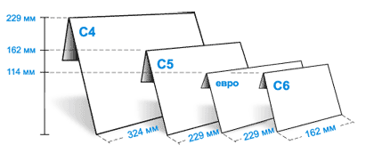 ![]() | С4 - 324 х 229 мм C5 - 162 х 229 евро - 110 х 220 С6 - 162 х 114 |