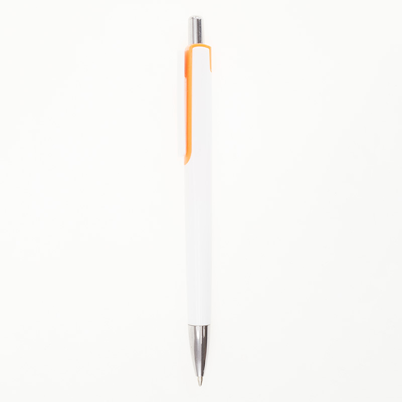 Пластиковая шариковая ручка, кнопочный механизм, белый глянцевый корпус с цветными вставками под широким клипом и хромированной кнопкой, хромированный носик. 145 мм.
