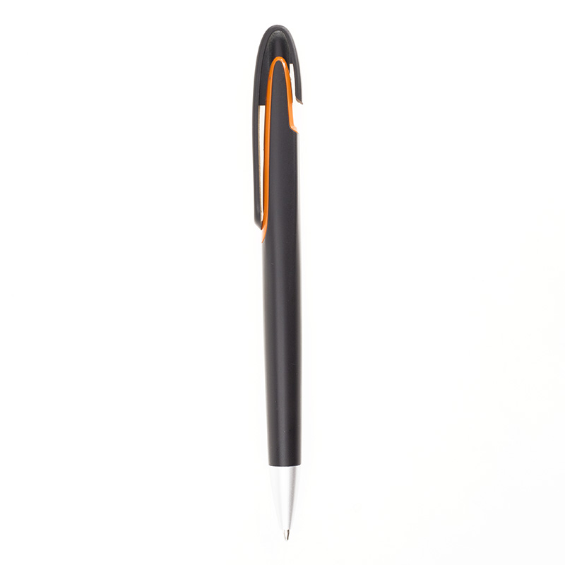 Пластиковая шариковая ручка оригинальной формы, кнопочный механизм, не прозрачный полуматовый черный корпус, цветная вставка под широким клипом-кнопкой, хромированный носик. 145 мм.