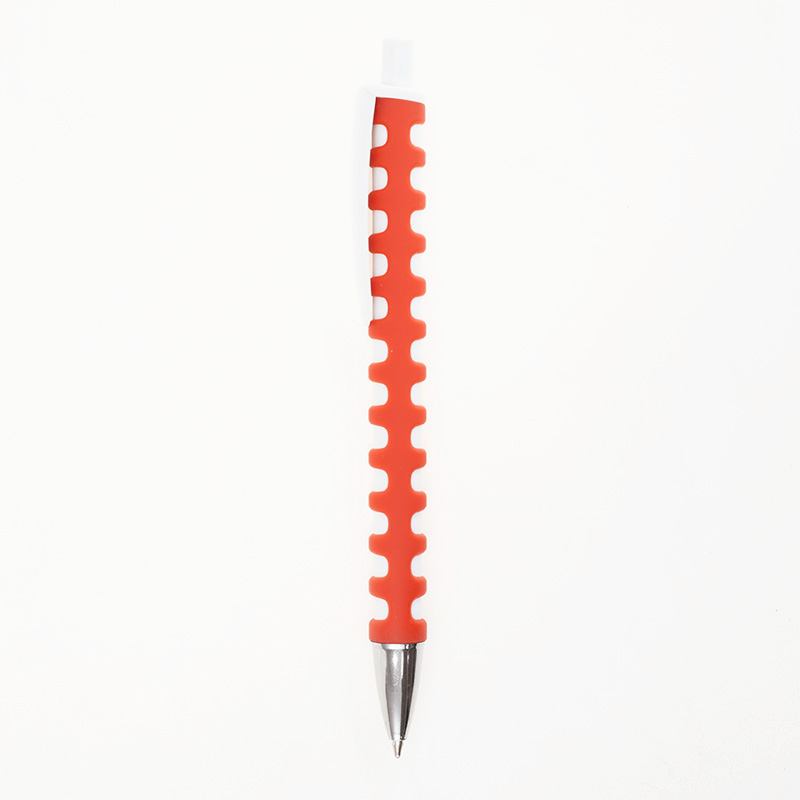Оригинальная пластиковая шариковая ручка, кнопочный механизм, белый не прозрачный корпус покрыт прорезиненной цветной накладкой вдоль всего корпуса, широкий не прозрачный клип, хромированный носик. 140 мм.