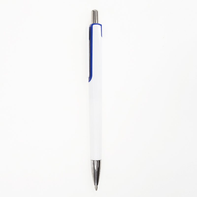 Пластиковая шариковая ручка, кнопочный механизм, белый глянцевый корпус с цветными вставками под широким клипом и хромированной кнопкой, хромированный носик. 145 мм.