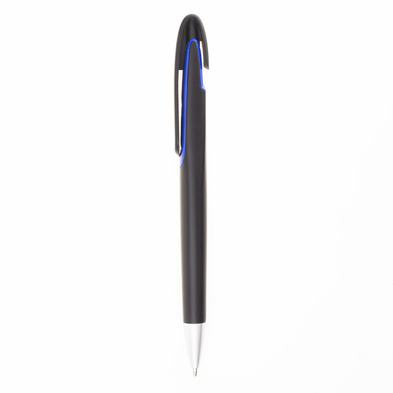 Пластиковая шариковая ручка оригинальной формы, кнопочный механизм, не прозрачный полуматовый черный корпус, цветная вставка под широким клипом-кнопкой, хромированный носик. 145 мм.