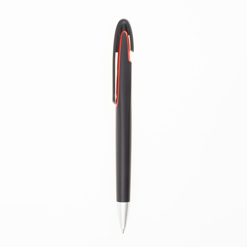 Пластиковая шариковая ручка оригинальной формы, кнопочный механизм, не прозрачный полуматовый черный корпус, цветная вставка под широким клипом-кнопкой, хромированный носик. 145 мм.