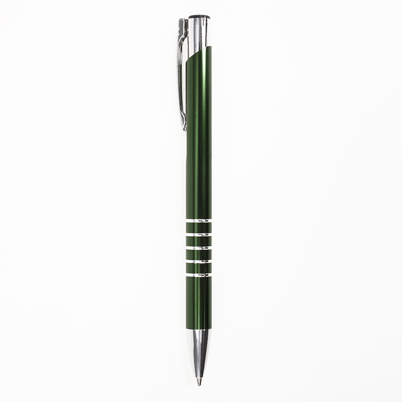 Металлическая анодированная алюминиевая ручка, кнопочный механизм, металлический хромированный клип-кнопка, 5 колец на зоне захвата, хромированный носик, цвет гравировки - серебро. 136 мм.
