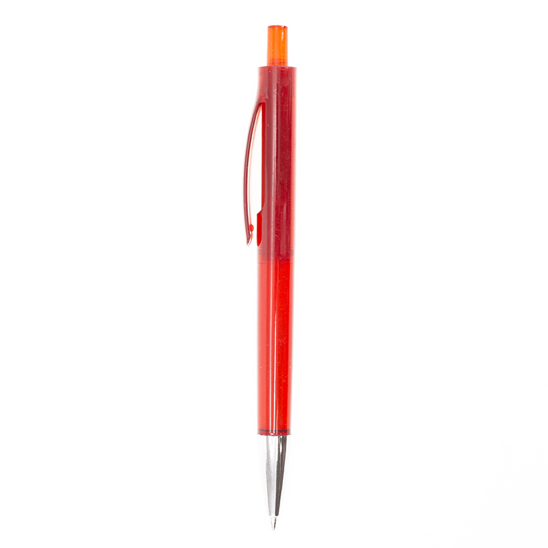 Пластиковая шариковая ручка, механизм – кнопка, прозрачный цветной корпус, широкий клип, хромированный наконечник. 140 мм.