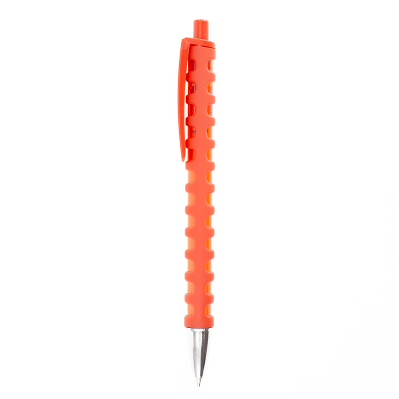 Оригинальная пластиковая шариковая ручка, кнопочный механизм, цветной прозрачный корпус покрыт прорезиненной накладкой вдоль всего корпуса, широкий не прозрачный клип, хромированный носик. 140 мм.