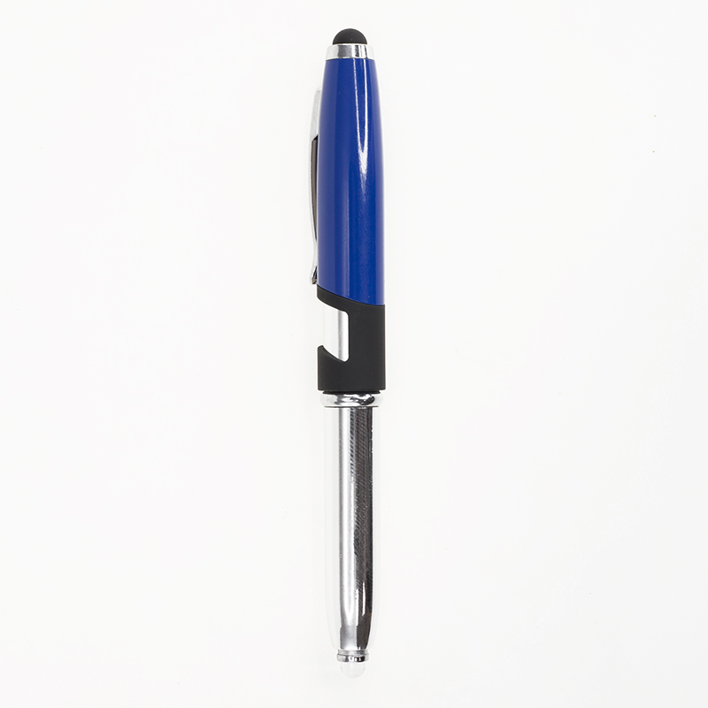 Мульти функциональная ручка - фонарик, стилуса и держателя для смартфона. Цветной металлический лакированный колпачке оборудован стилусом и держателем смартфона, ручка выполнена из пластика и покрыта хромом, на одном кончике ручке расположен яркий светодиодный фонарик, удобный для поиска мелочей в сумке, ящике или бардачке машины. Цвет гравировки колпачка - серебро. 127 мм.
