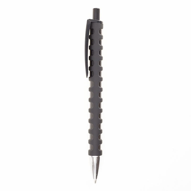 Оригинальная пластиковая шариковая ручка, кнопочный механизм, цветной прозрачный корпус покрыт прорезиненной накладкой вдоль всего корпуса, широкий не прозрачный клип, хромированный носик. 140 мм.