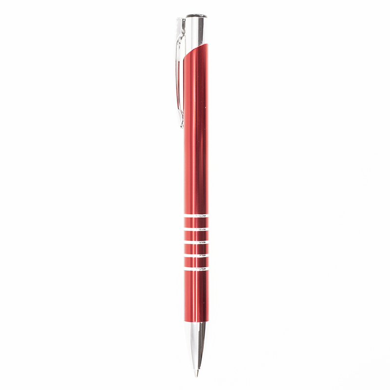 Металлическая анодированная алюминиевая ручка, кнопочный механизм, металлический хромированный клип-кнопка, 5 колец на зоне захвата, хромированный носик, цвет гравировки - серебро. 136 мм.