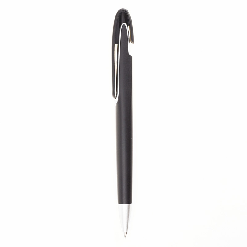 Пластиковая шариковая ручка оригинальной формы, кнопочный механизм, не прозрачный корпус цвет покрытия - металлик, хромированная вставка под широким клипом-кнопкой, хромированный носик. 145 мм.