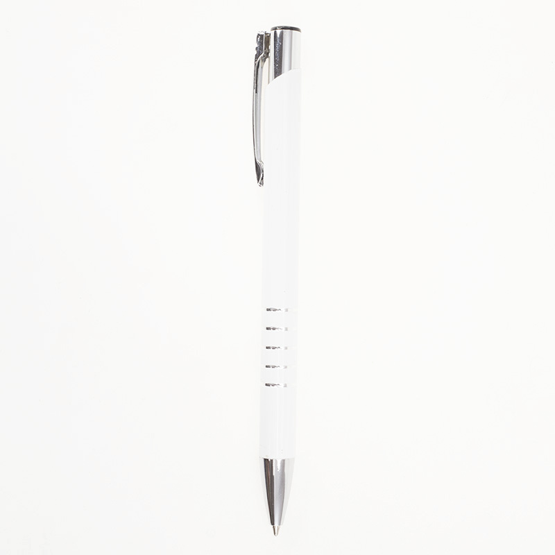 Металлическая анодированная алюминиевая ручка, кнопочный механизм, металлический хромированный клип-кнопка, 5 колец на зоне захвата, хромированный носик, цвет гравировки - серебро. 136 мм.