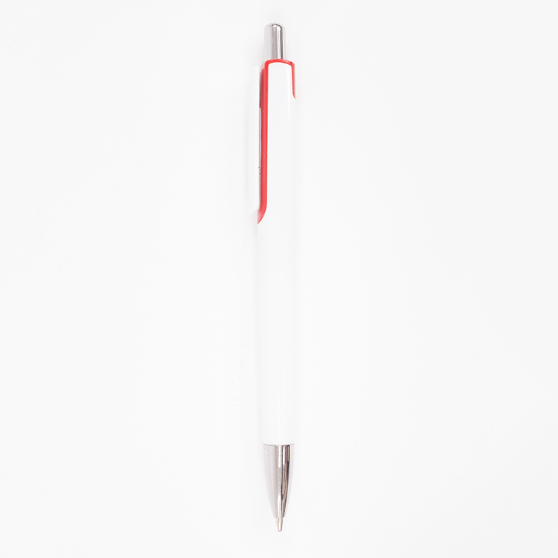 Пластиковая шариковая ручка, кнопочный механизм, белый глянцевый корпус с цветными вставками под широким клипом и хромированной кнопкой, хромированный носик. 145 мм.