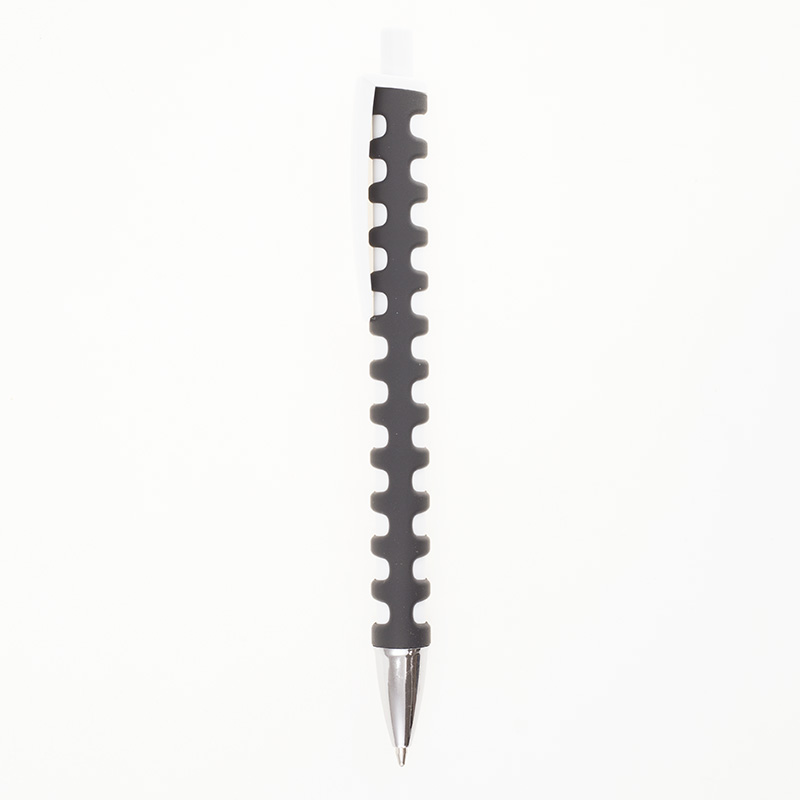 Оригинальная пластиковая шариковая ручка, кнопочный механизм, белый не прозрачный корпус покрыт прорезиненной цветной накладкой вдоль всего корпуса, широкий не прозрачный клип, хромированный носик. 140 мм.