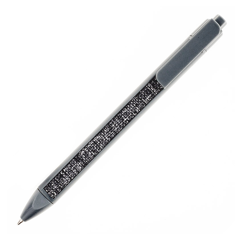 Уникальная, пластиковая, шариковая ручка с текстильной вставкой из меланжевой ткани.