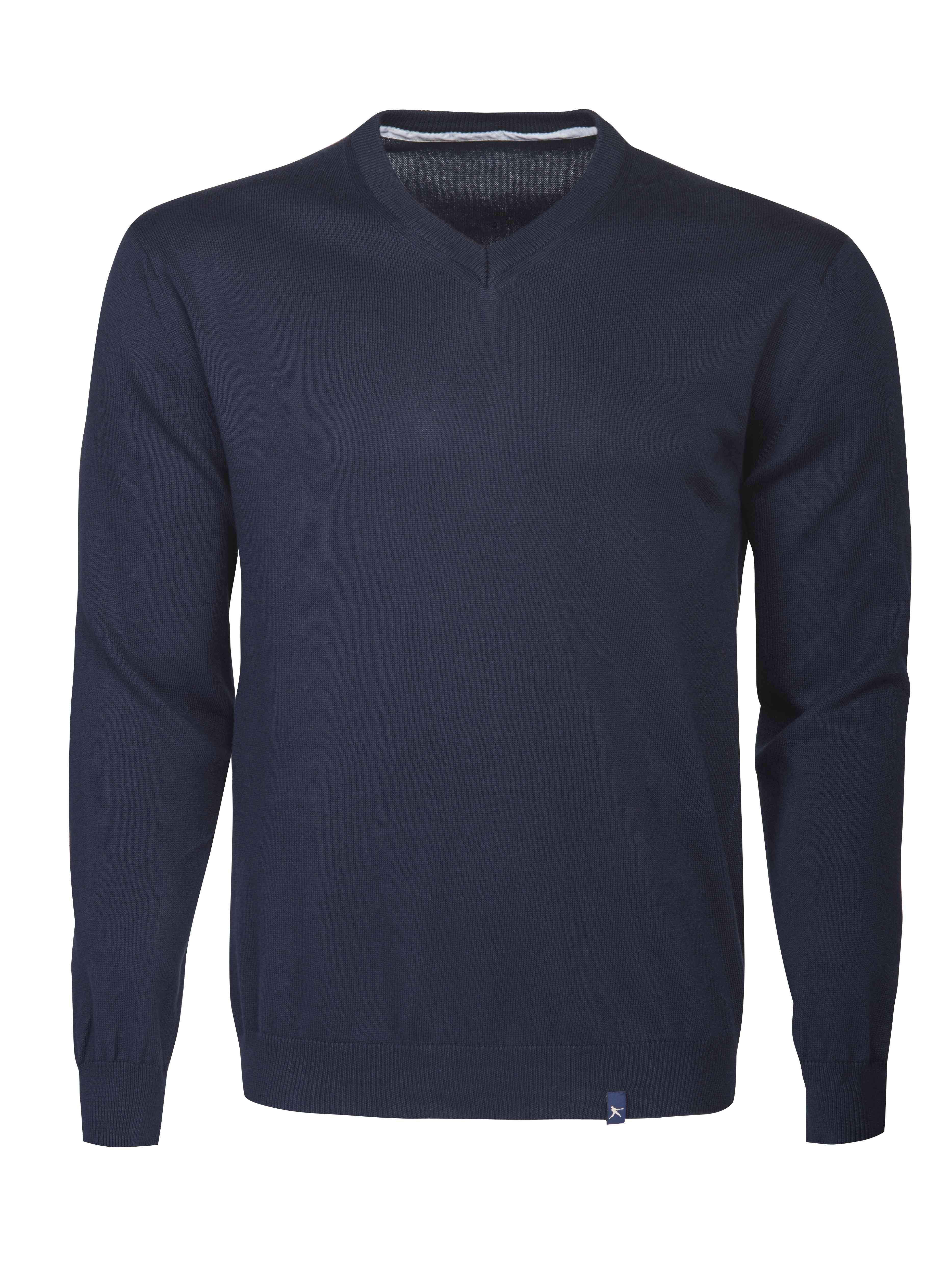 Высококачественный мужской свитер с V-образным вырезом из мягкого качественного хлопка. Укрепляющая тесьма по вороту. Воротник, манжеты и кромка укреплены плетением в резинку.
