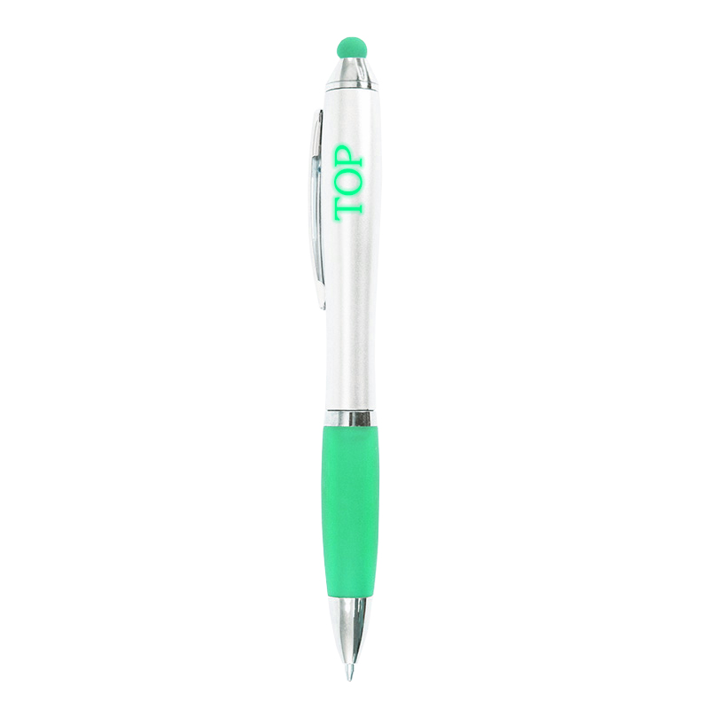 Уникальная, шариковая, автоматическая ручка Bergamo Lightlogo с функцией подсветки логотипа в цвет грипа и стилуса для сенсорных дисплеев. Подсветка включается кнопкой на корпусе. Корпус ручки серебристый металлик. Заменяемый стержень. Поворотный механизм. Цвет чернил - синий.