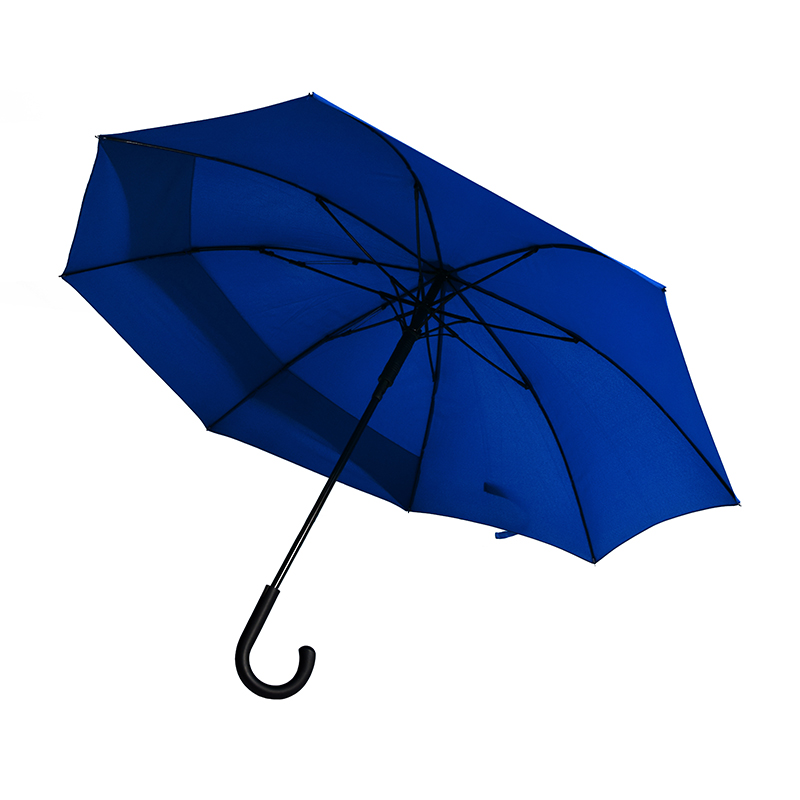Зонт-трость c автоматическим открытием, имеет надежный металлический стержень и цельные спицы из стекловолокна. Ручка зонта надежная и удобная. Зонт BACKSAFE не боится порывов сильного ветра и будет служить вам долго.