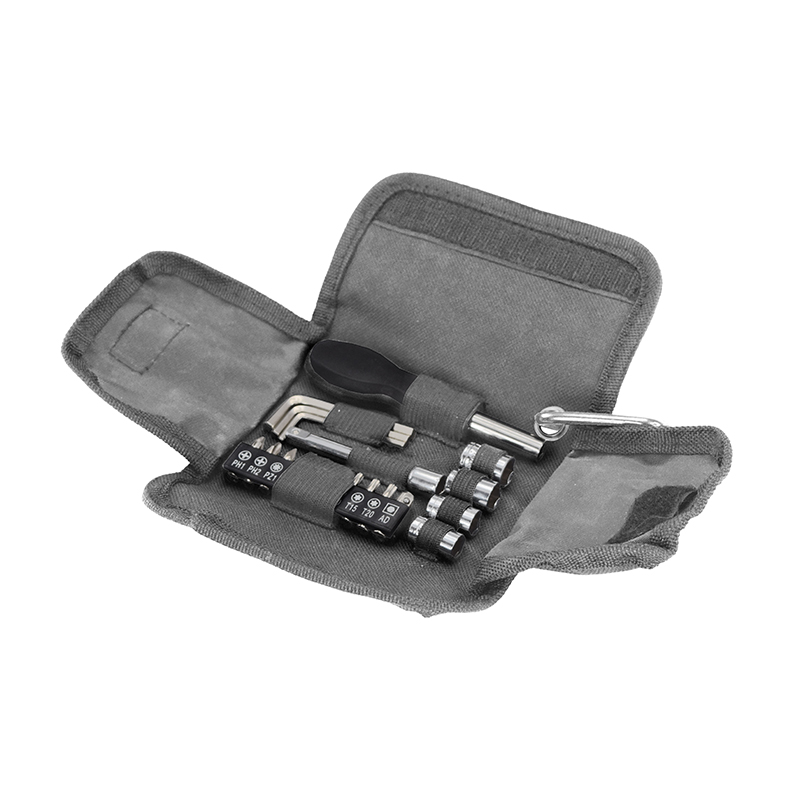 Набор инструментов 19 в 1 HELPER от Bergamo с самым необходимым количеством инструментов всегда будет уместен в любом доме или машине. В нём содержится всё необходимое для того, чтобы раскрутить, закрутить и для других видов монтажных работ. Удобная и практичная вещь для каждого мужчины и отличный подарок. Компактные размеры позволяют хранить набор прямо в бардачке автомобиля, а с помощью карабина можно подвесить за пояс. Компактный и недорогой, вот так лаконично и просто можно описать этого помощника. В комплекте идут такие инструменты: держатель для отверточных бит, удлинитель для держателя бит, набор бит (10 шт), 3 НЕХ ключи (3-5 мм), 4 торцевые головки (7-10 мм). Упакован в раскладывающемся чехле, на котором предлагаем нанести рекламный логотип. Изготовлен из стали с элементами пластика. Размер набора: 150х90х25 мм. Вес: 265 г.