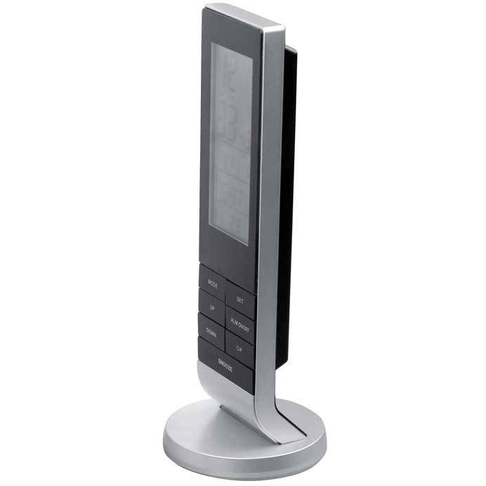Стильные, настольные часы на круглой подставке, кроме точного времени показывают температуру в помещении. С помощью нажатия кнопки можно выбрать режим отображения температуры: в градусах Цельсия или Фаренгейтах Будильник с выбором мелодий. Две минипальчиковые батарейки (ААА).