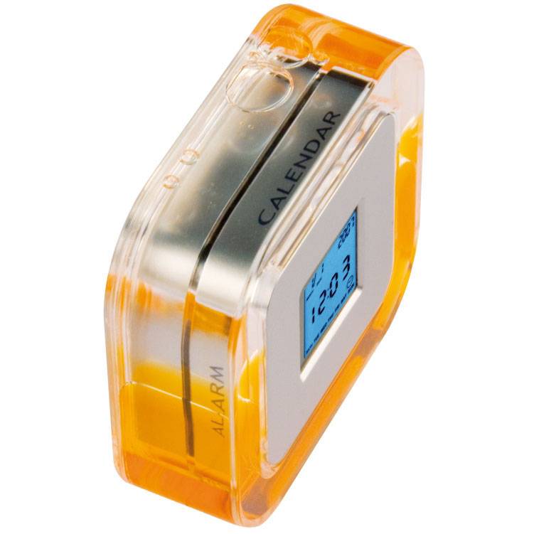 Настольные многофункциональные часы. Имеют календарь, будильник, термометр, а также подсветку. Внутри наполнены жидкостью оранжевого цвета