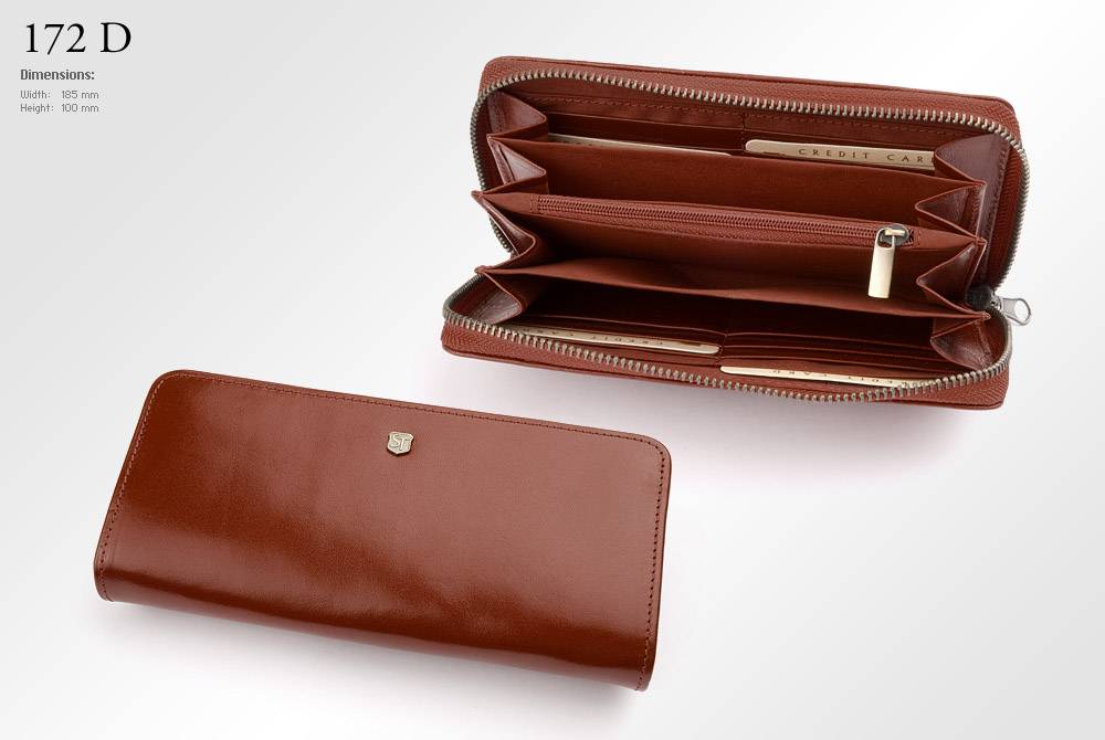 Бумажник женский из итальянской кожи. Четыре отделения для купюр, одно отделение на молнии,16 слотов для карточек. Закрывается с помощью молнии. Цвет: на выбор из палитры производителя. Размер изделия: h 100 х 185 мм.