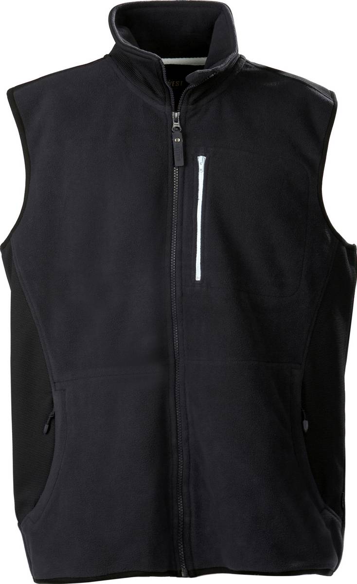 Ветронепроницаемый двусторонний флисовый жилет «унисекс» с контрастной тесьмой на шее и карманом на молнии спереди. Передние карманы на молниях.