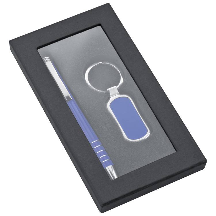 Набор состоит из: металлической ручки с синим стержнем и металлического брелка. Упакован в коробку. Группа нанесения: L1