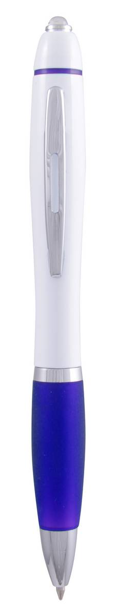 Двухцветная ручка cо встроенным светодиодным фонариком и поворотным механизмом. Металлический клип, глянцевый пластик, белое тело, цветная эластичная часть для удобства пальцев, серебристые элементы.