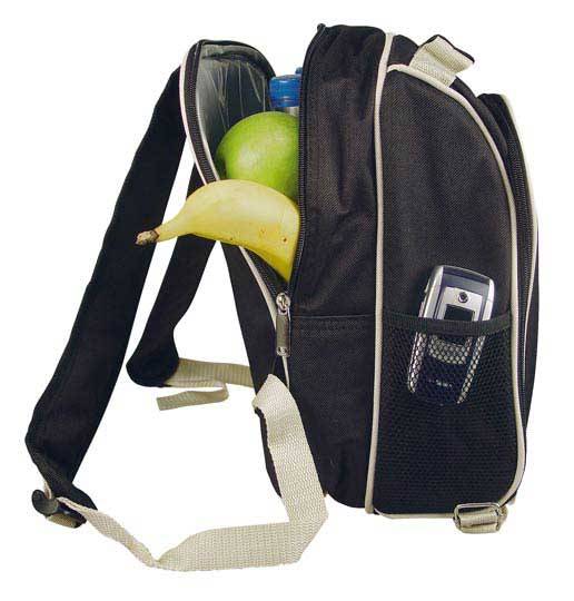 Рюкзак для пикника с комплектом столовых приборов для четырёх человек с доской для резки и солонкой. Имеет два наружных боковых кармана для бутылок и внешний карман, закрывающийся на молнию, на котором предлагаем нанести рекламный логотип.