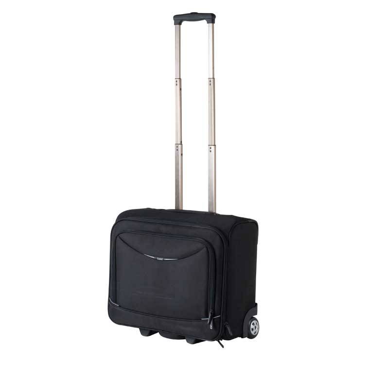 Элегантная, деловая сумка на колёсиках с высовывающейся ручкой и идентификатором. Внутри имеется множество перегородок и карманов, а так же место для ноутбука.