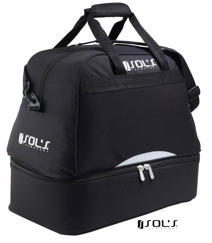 Спортивная сумка с отделением для обуви SOL’S CALCIO. Двухцветная, основное отделение с застежкой-молнией; карман на молнии в центральной части ручки из нейлона 600D с фиксатором для удобства; регулируемый ремень из нейлона для ношения на плече.