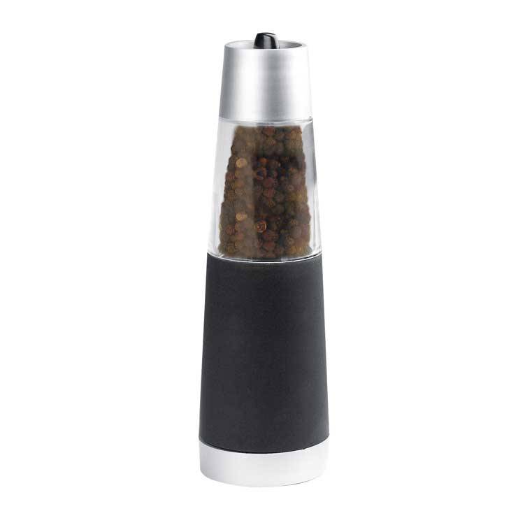 Электрическая мельница для перца конусообразной формы. Обтянута тонким резиновым слоем, позволяющим комфо пользоваться им. Реклама на нижней части корпуса.