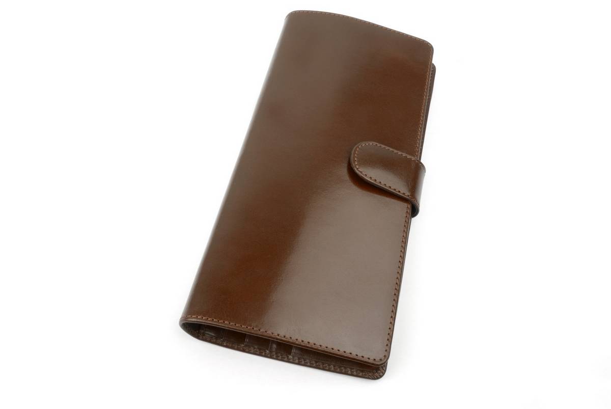 Портмоне для путешествий из итальянской кожи, закрывается на кнопку, 2 внутренних отдела в которых 2 кармана, 2 дополнительных кармана, один из которых на молнии, держатель для ручки и 12 слотов для визитных карточек. Размер изделия: h 230 х 110 мм.
