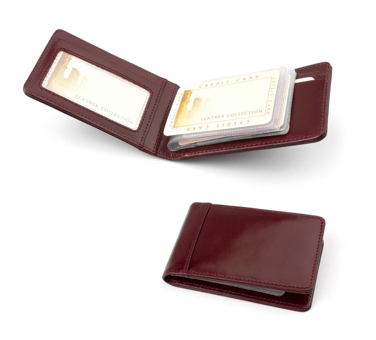 Визитница из итальянской кожи. 2 слота для карточек, 20 прозрачных страниц для карточек, 1 прозрачный карман для фото, 3 дополнительных кармана. Размер изделия: h 75 х 115 мм.