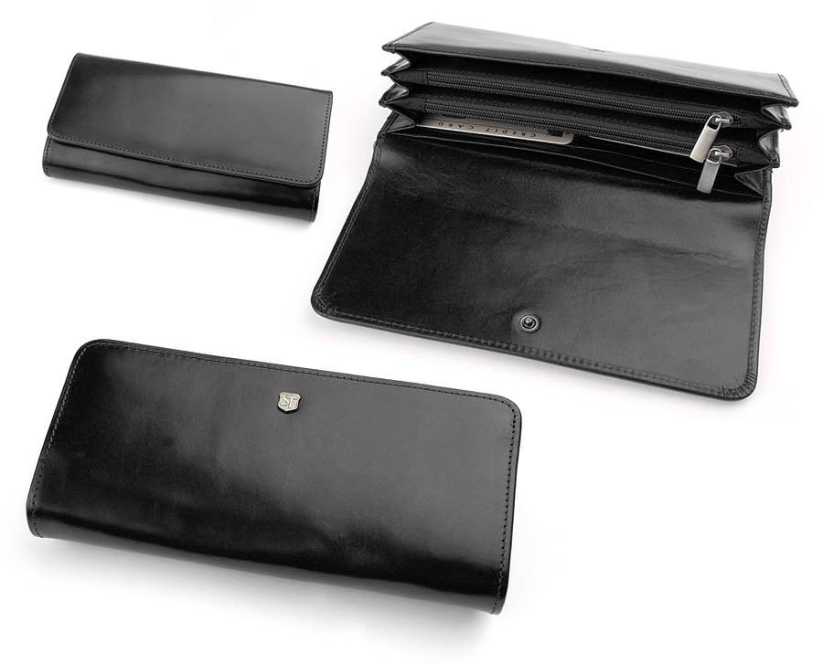 Бумажник женский из итальянской кожи. Три отделения для купюр, одно двойной карман для мелочи, 2 отделения на молнии, 2 прозрачных кармана для фото, 10 слотов для карточек. Закрывается с помощью молнии. Размер изделия: h 100 х 190 мм.