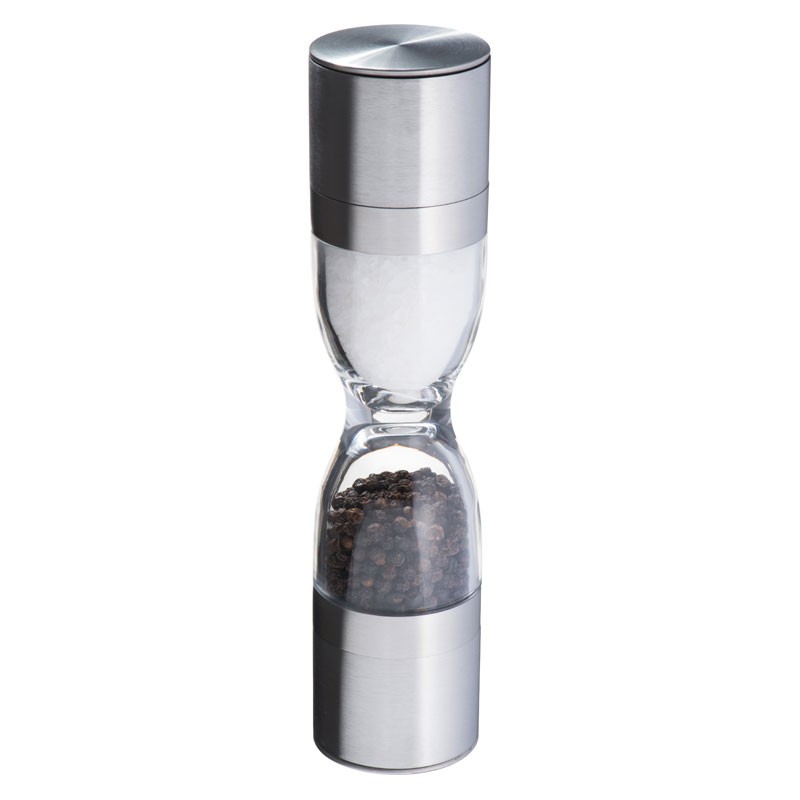 2в1 контейнер для соли и перца. Сделано из нержавеющей стали и пластика с 2 керамическими механизмами. Логотип может быть нанесен на металлическом центре контейнера. Упакован в подарочную коробку. Группа нанесения L3.