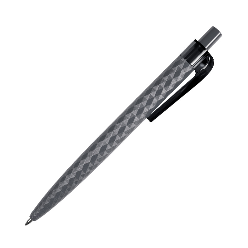 Трендовая шариковая ручка из матового пластика с рельефной ромбической поверхностью и полупрозрачным цветным клипом.