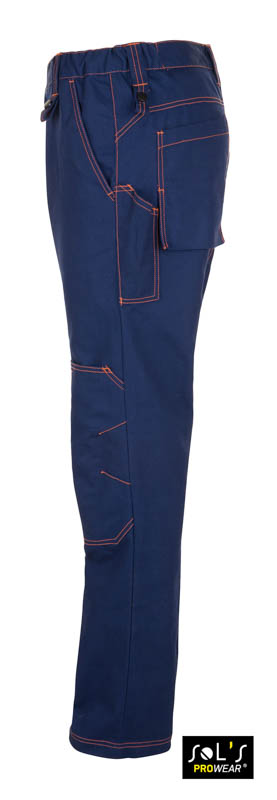 Брюки рабочие SOL'S SECTION PRO – Профессиональная рабочая одежда. Идеально подходит для строительных бригад, работников автосервисов, складских работников, работников сервисных служб и служб доставки. Брюки сочетают высочайшую износостойкость (плотность- 300 г/м кв., смешенная ткань 65% полиэстера и 35% хлопка) и функциональность. Пояс полуэластичный с петлями для ремня. 6 объемных карманов (2 задних навесных, 2 передних, 2 на коленях – для съемных наколенников) + петельки с кнопками для съемного кармана. Специальная этикетка для указания персональных данных вшита внутри. Контрастная строчка.