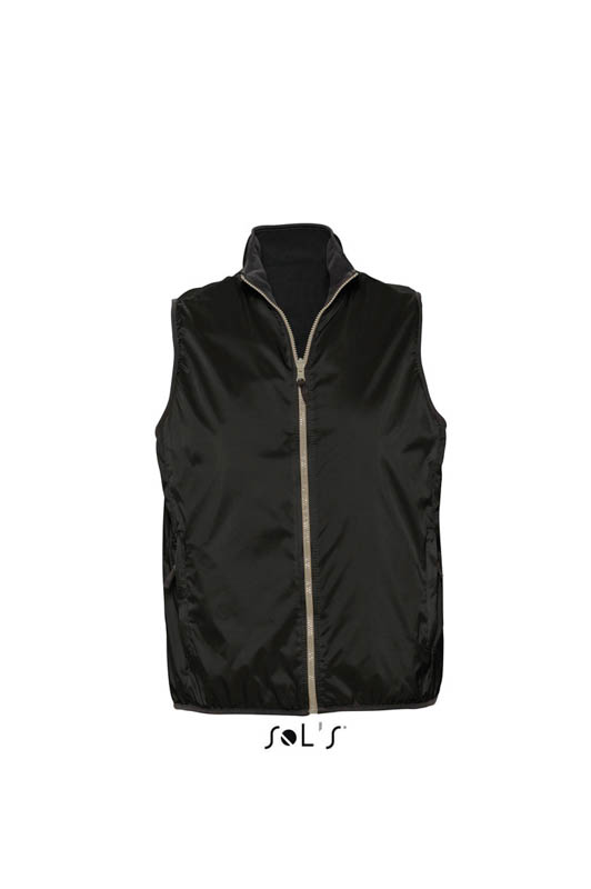 Двухсторонний водоотталкивающий и ветрозащитный жилет unisex. Воротник с подкладкой из флиса. Косые бейки из светло-серого джерси полиэстра на воротнике, проймах и по низу изделия. Два боковых окантованных кармана на нейлоновой молнии, двухсторонний замок, молнии с ухваткой из ткани в тон подкладки.