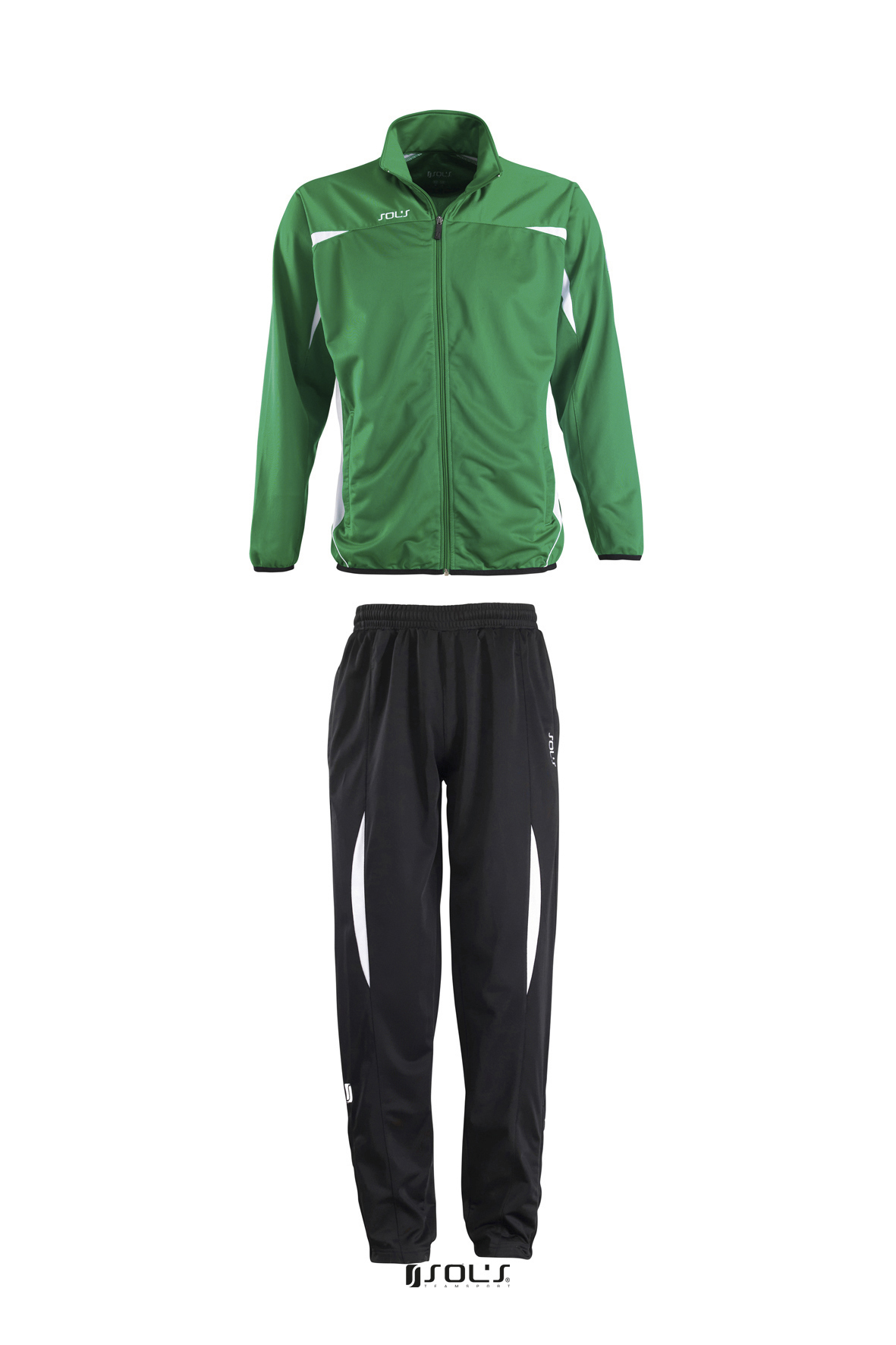 Тренировочный костюм SOL’S CAMP NOU. Куртка, пояс и манжеты отделаны эластичной диагональной резинкой. Передняя застежка и карманы на молнии. Большие контрастные перфорированные вставки по бокам и на рукавах гарантируют оптимальную воздухопроницаемость. Материал: Интерлок, блестящий полиэстер