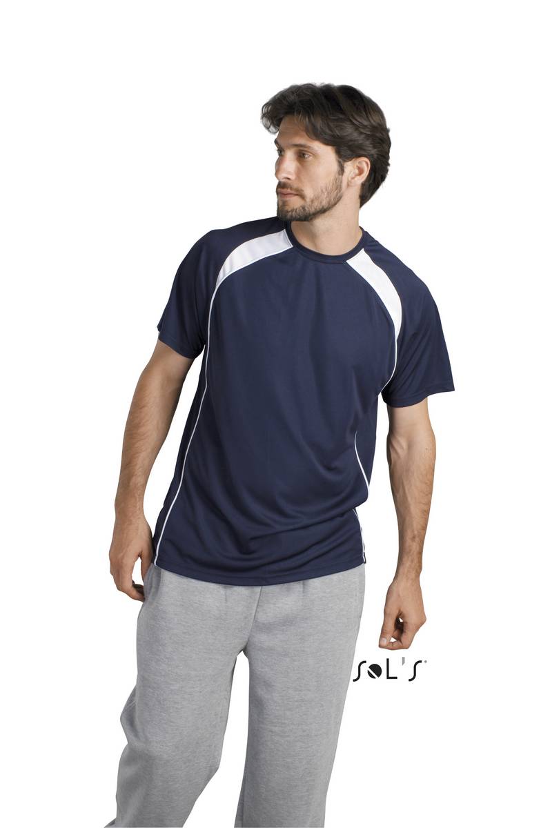 Футболка мужская двухцветная SOL’S MATCH. Стиль: спортивный И модный. Контрастные рукава реглан, обработка ворота и канты. Материал: ИНТЕРЛОК ПОЛИЭСТЕР 140, 100% воздухопроницаемый полиэстер. Вариант поло: PALLADIUM - 11418, стр.53.